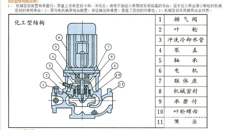6、IHG型單級單吸管道化工泵可根據(jù)管路布置的要求采用泵的豎式和橫式安裝。
